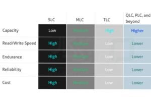به طور کلی، فلش SLC بهترین عملکرد را دارد در حالی که فلاش با چگالی بالاتر مانند TLC ارزان تر است و ظرفیت بالاتری دارد.