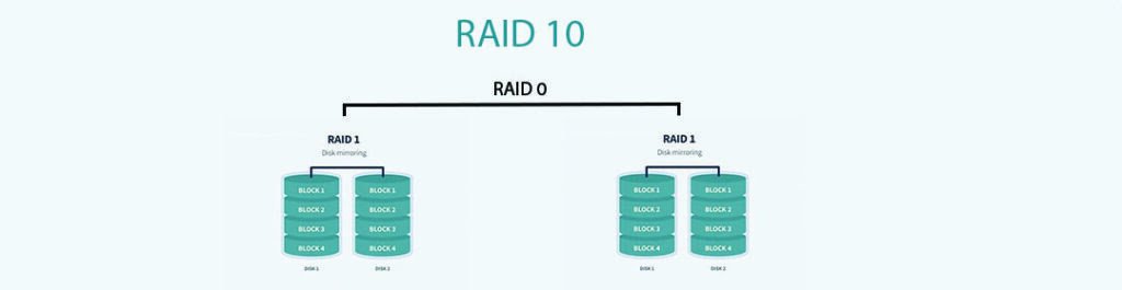 RAID 10 ترکیبی از RAID 1 و RAID 0 می باشد که حداقل تعداد دیسک در این RAID ، چهار hard disk می باشد .و همچنان نصف فضای hard برای RAID ها استفاده می شود پس نصف فضای hard ها قایل استفاده میباشد.