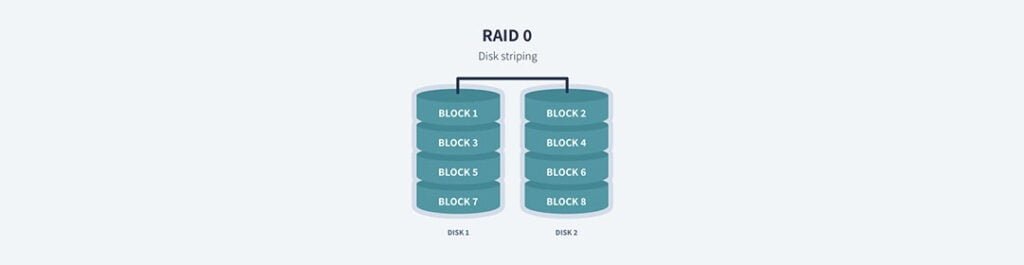 در این رید از روش striping استفاده میی شود که به معنای نوشتن اطلاعات بر روی دیسک به صورت بلوک بندی است . Raid 0 در واقع رید محسوب نمی شود ، چرا که در این سطح خبری از backup گرفتن نیست و اگر hard disk شما آسیب ببیند شما برای همیشه اطلاعات خود را از دست داده اید .