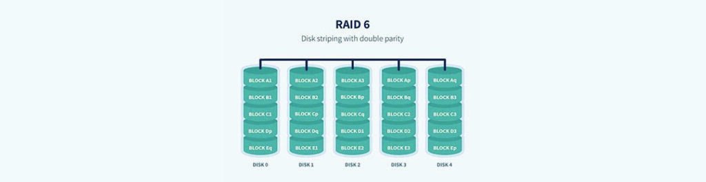 در Raid 6 دو hard disk به parity اختصاص می یابد .در این RAID به جای یک بلوک PARITY دو بلوک داریم پس اگر 2 دیسک از دست بدیم می توانیم اطلاعات آن هارا بازیابی کنیم .